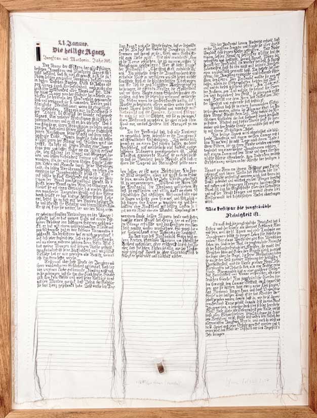 Göttlicher Humor, (Agnes), Divine Humor, (Agnes), 2017, pencil and pens on raw silk, relics (blood, hair) in a handmade oakwood frame, quotes by Georg Ott, 41.73” by 31.89”, 106 x 81 cm -